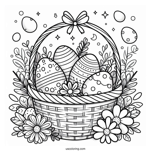 Easter Coloring Page Of Duck Inside Flower Basket With Easter Eggs